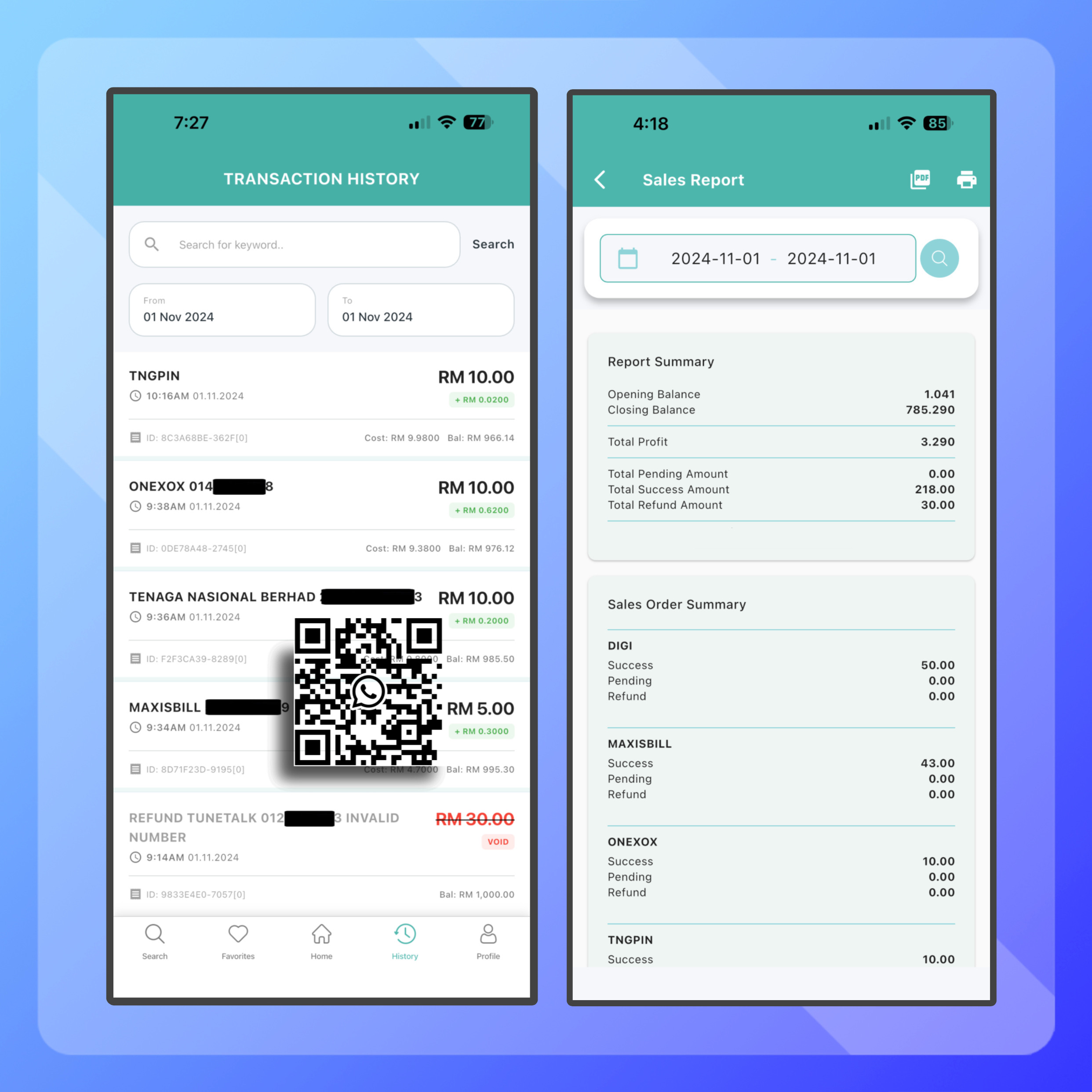 ✓ Boleh menjual pelbagai topup (telco, pin, voucher, games, antarabangsa) serta membayar bil utiliti dan telefon, serta boleh mendaftarkan dua level downline.